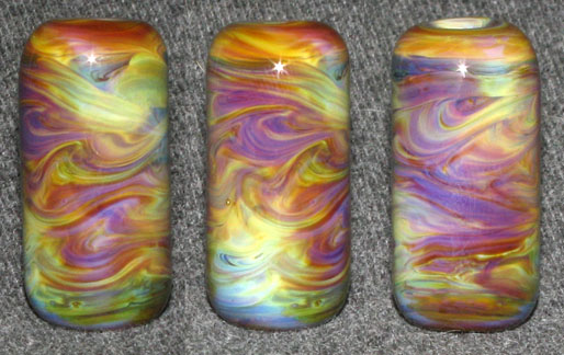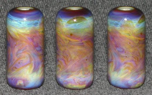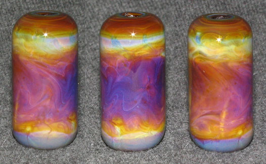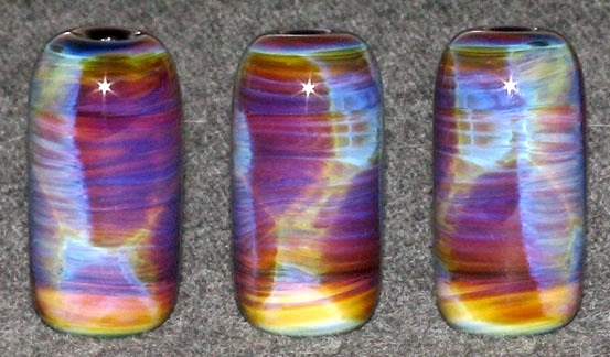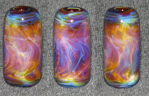 The variations in color shown in the sample bead photos are primarily due to variations in the heating and cooling of different parts of the beads. Because it is easier to vary the heating on a larger or longer bead, those type of beads will usually show better color variation than a standard, small round bead. Since a small round bead tends to stay a relatively uniform temperature throughout while being worked, there will be less variation in the color. One can intentionally spot-heat parts of a small round bead to help overcome this, but it can still be difficult to get enough temperature variation to achieve a wide variety of colors in a small bead. For this reason, silver glasses will usually produce better results on larger/longer beads.