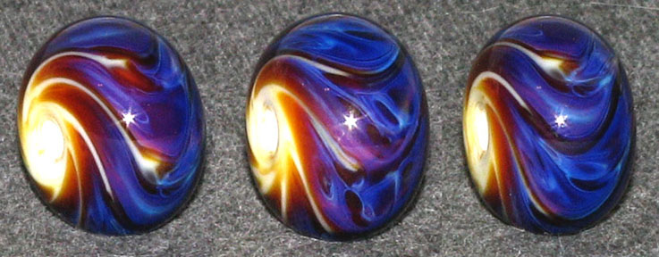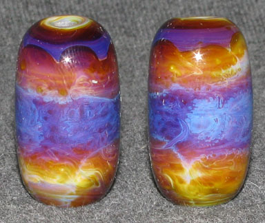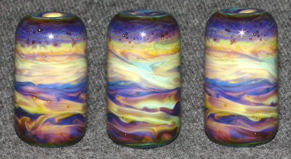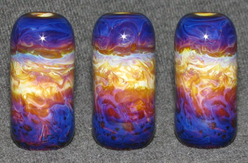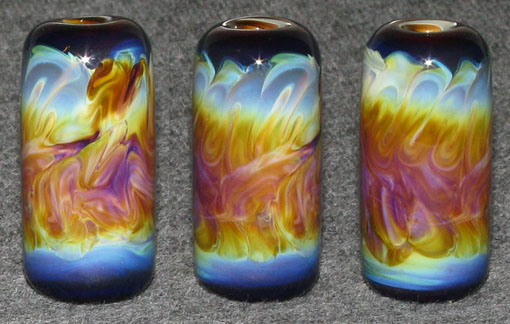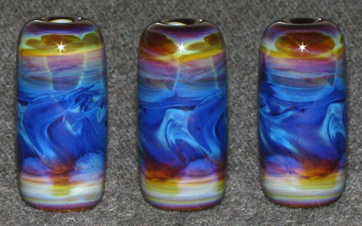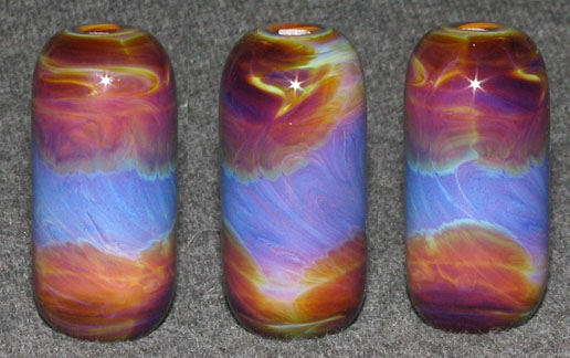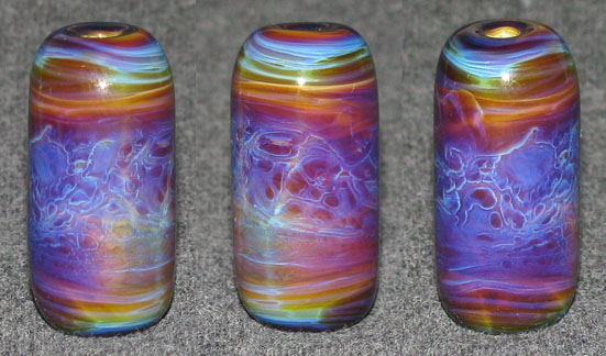 CMX530 glass typically strikes to a somewhat narrower range of colors than many of my other glasses. While it can still give nearly any color(s) depending on how it is worked, various shades of blue and purplish blue seem to predominate, along with light and dark ambers. Shades of purple on a yellowish tan background are fairly likely if the glass is overstruck and then the striking sequence started again one or more times. Colors generally lean toward darker shades, although pastels are possible too. CMX530 can give good color variations if you lay down hot glass on cold or otherwise lay down the surface glass in a non-uniform way. When done this way, the glass will usually hold the color variations, even after the entire bead has been reheated. If overstruck, the striking sequence can be restarted by getting the glass very hot, cooling, and starting over. Although this glass can give some very nice colors it can be somewhat difficult to strike and may require some patience and experimentation to get the best results. For this reason I don't recommend it for silver glass novices. Although it can sometimes be difficult, a little practice with it can pay off.