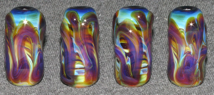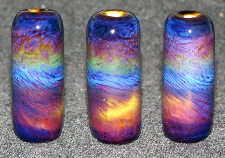 Some nice color variation can often happen on beads made with a metal bead press, particularly flattened or diamond shaped beads. One suggestion I would have for those making flattened types of beads is to give a quick shot of a hot, sharp flame to the middle of the bead. Then let it cool a bit and very gently heat the entire bead. I've seen some very nice color patterns produced like this. But as always, experimentation is the best way to determine what works well with your particular setup.